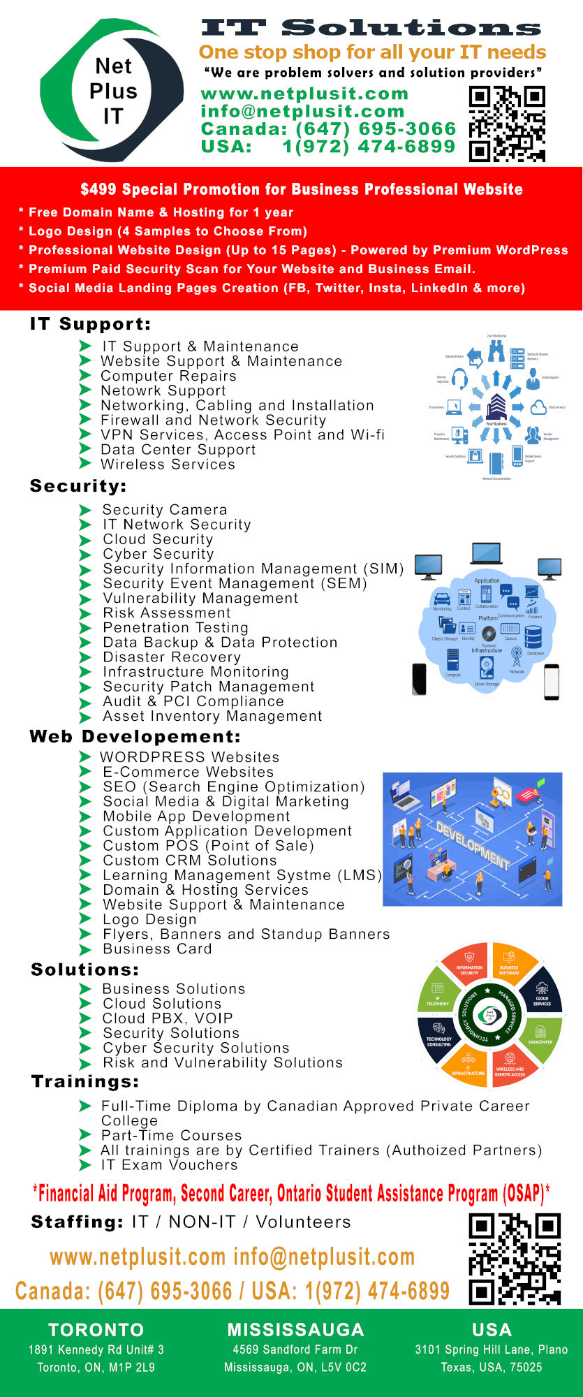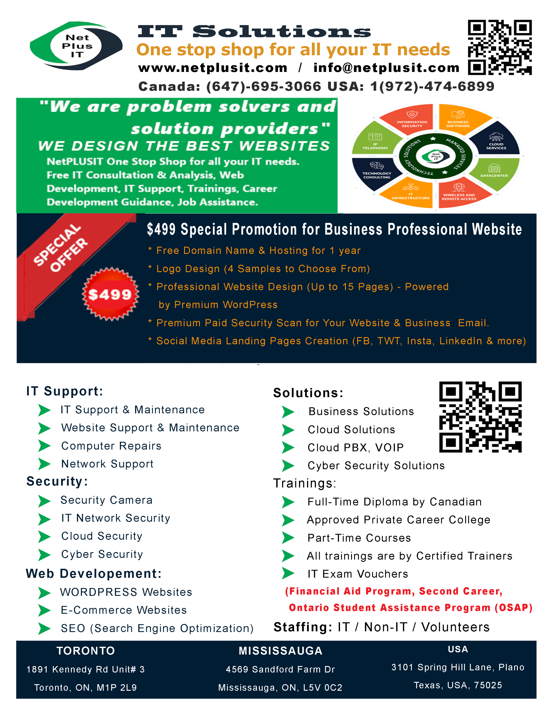 PROMOTION Website Package $499 Professional Business Website View More E-Commerce Website View More Website Monthly Maintenance View More SEO (Search Engine Optimization ) View More Social Media Digital Marketing View More Mobile App Development View More Domain & Hosting Services View More NetPLUS College View More Discounted Exam Vouchers View More Request A Quote First Name Last Name Email Address Phone Company Your Budget Type of Website You Need? Type of Website You Need?BusinessEducationalSportFood, RestaurantStatic WebsiteE-commerce WebsiteNon-ProfitOthers Packages you are looking for? Packages you are looking for? Professional Business Website E-Commerce Website Monthly Maintenance Digital Marketing SEO Please specify your requirements. 15 + 8 = Submit